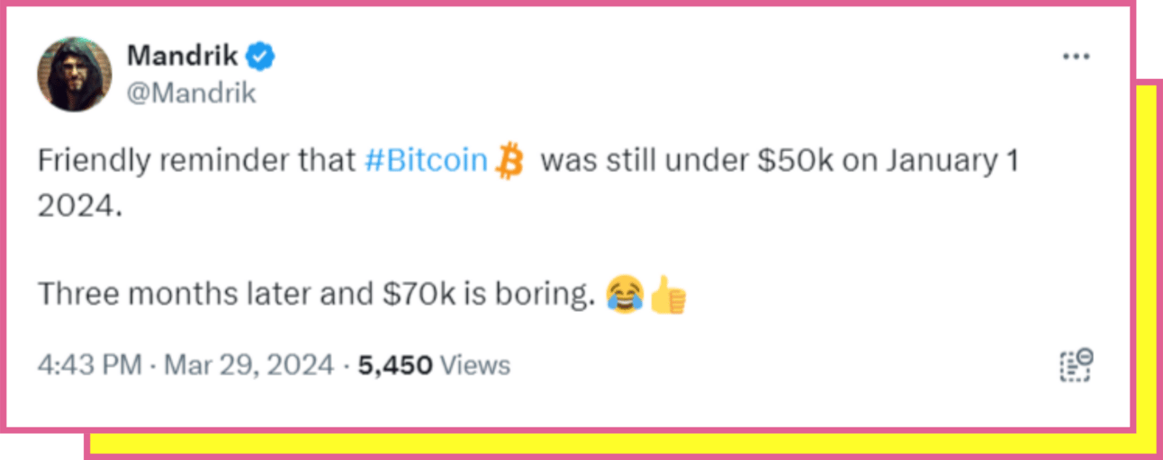 Investors are closely monitoring BTC's price action, weighing technical signals against broader market dynamics. Despite the recent stagnation, optimism persists for a potential rally, with discussions ranging from potential buy-the-dip opportunities to speculative scenarios such as a dead cat bounce or a surge towards $75,000 or even $80,000.