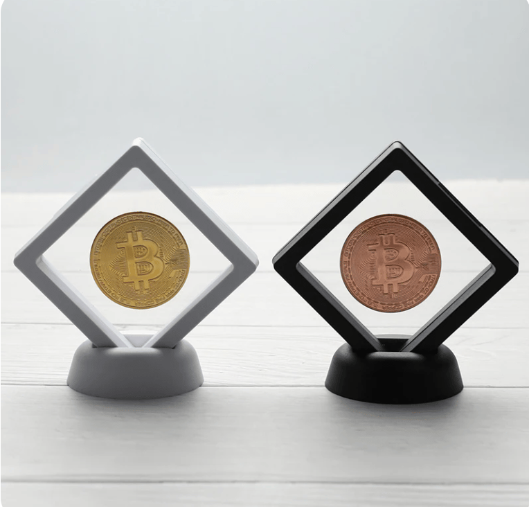 Crafted with precision and attention to detail, this coin features the iconic Bitcoin logo on one side and the groundbreaking blockchain on the other. It's like holding a piece of the future in your hands – and now, you can display it proudly on your desk, shelf, or wherever you want to show off your crypto-savvy style.