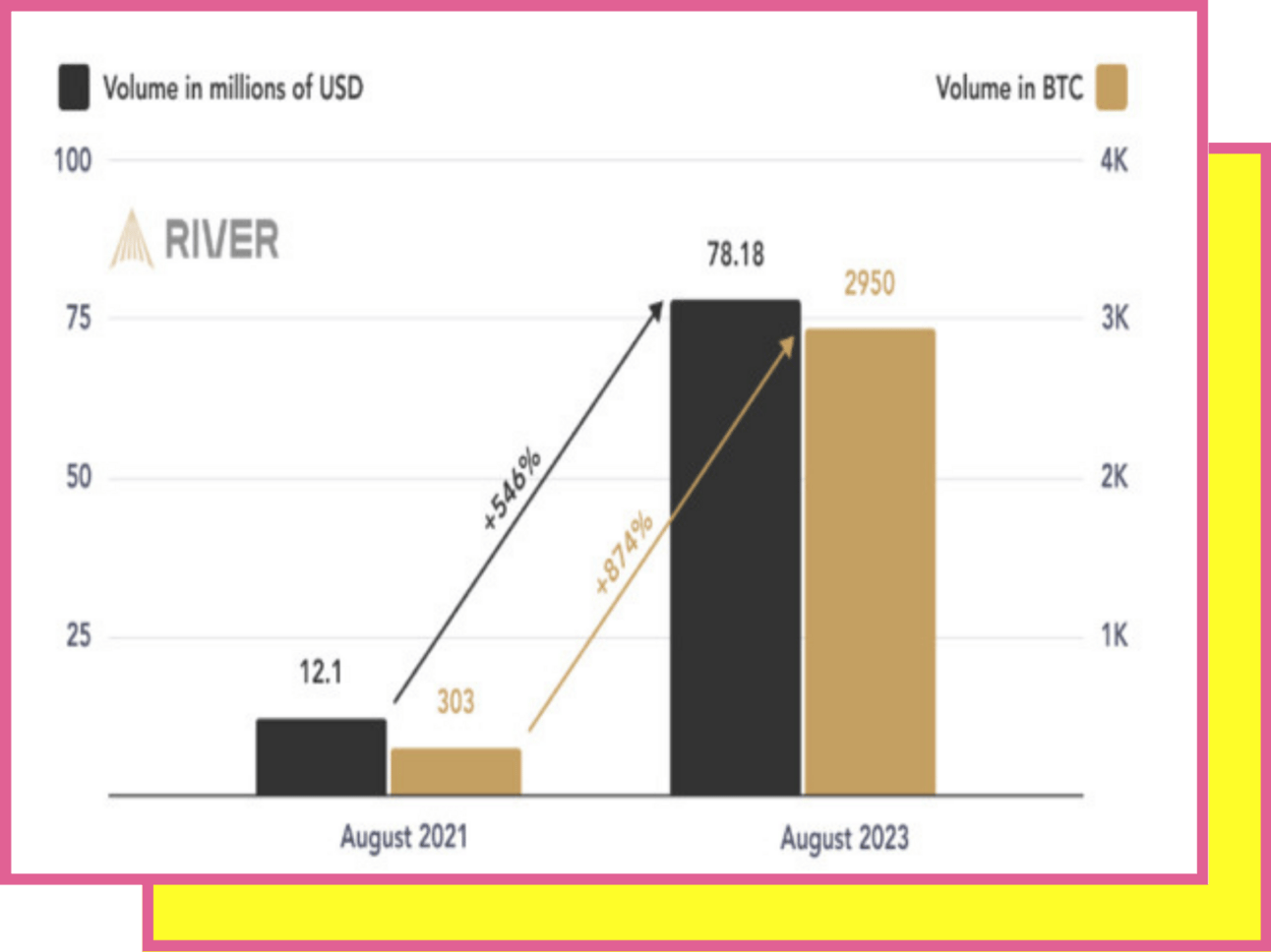 The reported 6.6 million figure for Lightning routed transactions by River should be seen as a conservative estimate, representing the lowest possible value they could determine. For the comparison, the 503,000 figure from August 2021 came from a study by K33, previously known as Arcane Research. River clarified that it couldn't account for private Lightning transactions or those involving only two participants. Notably, in August 2023, Lightning processed a transaction volume of $78.2 million, which reflects a remarkable 546% surge from the $12.1 million recorded in August 2021, as reported by K33. This data highlights that Lightning is now handling at least 47% of Bitcoin's on-chain transactions, a significant development in Bitcoin's evolution as a medium of exchange. It's an interesting metric to keep an eye on as Bitcoin continues to evolve in its use cases.