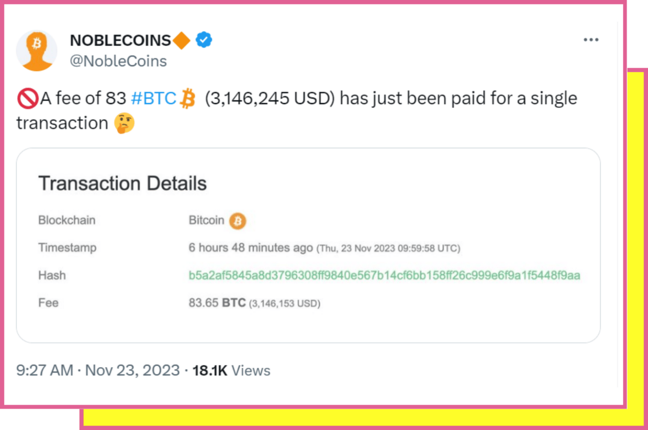 So, there's this Bitcoin user who tried to transfer 139.42 BTC, right? But here's the kicker – they accidentally paid a whopping $3.1 million in transaction fees! Imagine that, more than half the value of what they were actually sending.